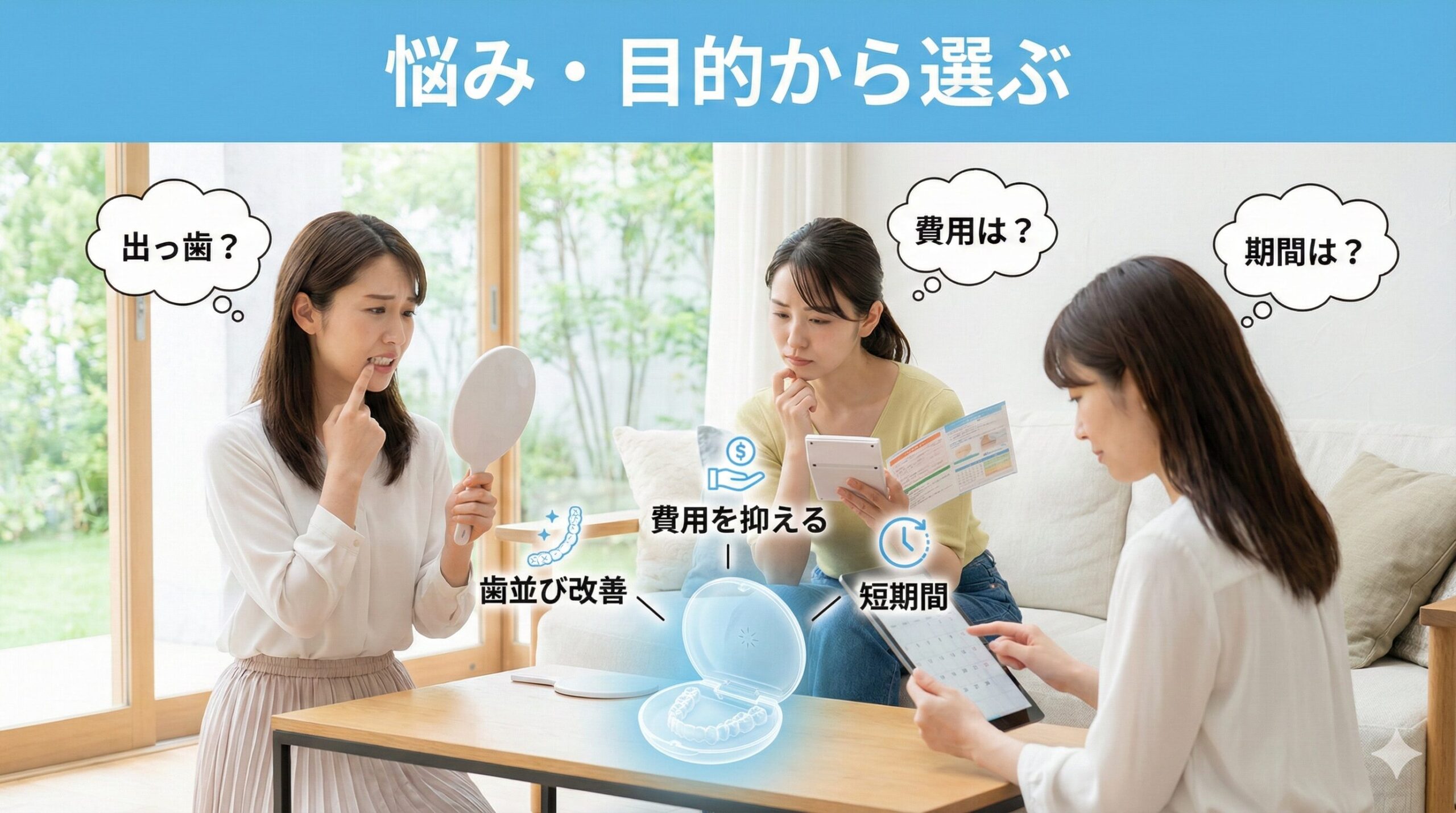 「出っ歯」や「受け口」といった歯並びの悩みから、「費用」や「期間」などのご希望に合わせて、あなたにぴったりの治療法やブランド選びをお手伝いします。